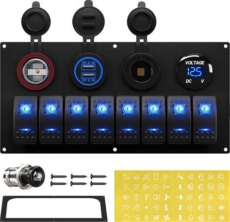 RVBOATPAT Marine Boat Switch Panel Waterproof 8 Gang 12V Rocker Switch Panel 12 Volt Toggle Switch Panel Blue LED Lighted For Automotive Car Truck
