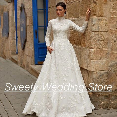 Customized Islamic Muslim Hijab Wedding Gowns 2025 Bride A-Line Long Sleeve Bridal Dress Lace Arabic