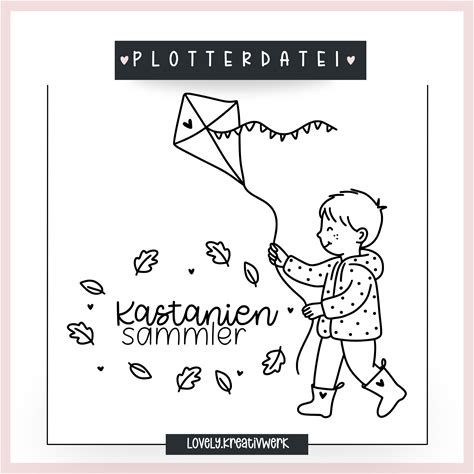 Plotter File Autumn Chestnut Collector Saying Kite Flying Child Leaves Plotter File Illustrations SVG + PNG Laser Engraving + Commercial License